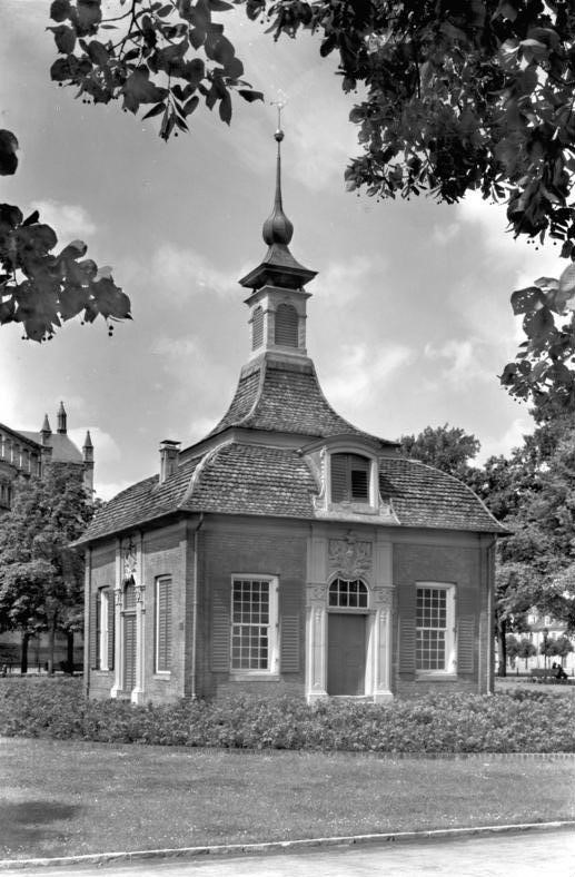 In der Mitte des Bassins befand sich eine Insel. Dort errichtete der holländische Architekt Jan Bouman in der Sichtachse zur Brandenburger und Benkertstraße einen kleinen Pavillon, Gloriette genannt. Dieses königliche Lusthaus nach holländischer Manier entstand im Auftrag Friedrich Wilhelms I. im Jahr 1739. Die Gloriette war für die zweite barocke Stadterweiterung von zentraler Bedeutung, da sie im Schnittpunkt der beiden neuen Blickachsen lag. Sie war, bevor im 19. Jahrhundert die Kirche auf dem Bassinplatz gebaut wurde, schon vom Brandenburger Tor aus zu sehen. Lediglich zwei Feste fanden in dem Pavillon statt: Die Einweihung 1739 und die Gedenkveranstaltung zum ersten Jahrestag der Schlacht bei Hohenfriedberg im Jahr 1746. Im Volksmund wurde es auch Tabakshäuschen genannt, weil das sogenannte Tabakskollegium des Soldatenkönigs hier zusammengekommen sein soll.