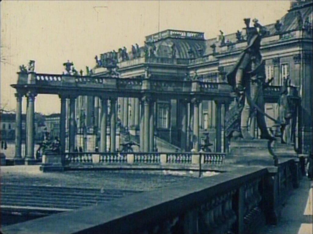 Die Abfolge der Tableaus wirken an heutigen Sehgewohnheiten gemessen etwas nüchtern. Sie ist einem Lichtbild-Vortrag ähnlicher als den damals ebenfalls verbreiteten Gattungen Aktualität oder Lokalbild, die den Kinobesucher*innen immer auch Neues, Außergewöhnliches, Unterhaltsames bieten wollten.1 Für eine erklärende Kommentierung, vielleicht durch einen Lehrer, hätte sich „Potsdam“ bestens geeignet. Über einen derartigen Einsatz des Films kann aber nur gemutmaßt werden. Und trotzdem handelt es sich bei dem Kurzfilm um ein einzigartiges Zeitzeugnis, das uns gerade durch seine konventionelle Motivauswahl und prosaische Darstellungsweise einiges über das damalige Selbstbild der Stadt erzählt. Hier geht es zuallererst um die Wiedererkennbarkeit prunkvoller Architekturen. In pittoreske Bildkompositionen eingefügt, schmeicheln sie einem nostalgischen Blick. Potsdam ist in diesen Bildern noch ganz und gar als Residenz- und Garnisonstadt präsent – die es 1920, seit Versailler Vertrag und Abdankung des Kaisers, nicht mehr war.