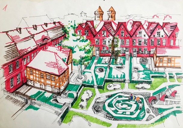Die Protokolle der Sitzungen des Rates der Stadt Potsdam zeigen, dass es 1984 noch einmal eine umfassende Planung von Maßnahmen zur Verwirklichung der Rekonstruktion des Holländischen Viertels gab.7 Es wird noch einmal ausdrücklich betont, dass es keinen Abriss der Häuser geben sollte und dass ein familienfreundliches Wohngebiet, mit Freiräumen und Spielstätten in den Innenhöfen, entstehen sollte. Im Viertel sollte es einen Kindergarten, gastronomische Einrichtungen wie den „Fliegenden Holländer“, Handwerks- und Dienstleistungseinrichtungen wie eine Goldschmiede und Porzellanmalerei, Ateliers für Künstler:innen und Verkaufs- und Service-Läden wie eine Boutique für Putz, Mode und Blumen geben. Die gesamte künstlerische Gestaltung des Ensembles sollte der Verband Bildender Künstler der DDR im Auftrag des VEB Umweltgestaltung und bildende Kunst Potsdam übernehmen. Geplant wurde unter anderem für die Innenhöfe ein „Spielgarten Holländische Mühle“ und ein „Tulpenhof mit Delfter Brunnen“.8