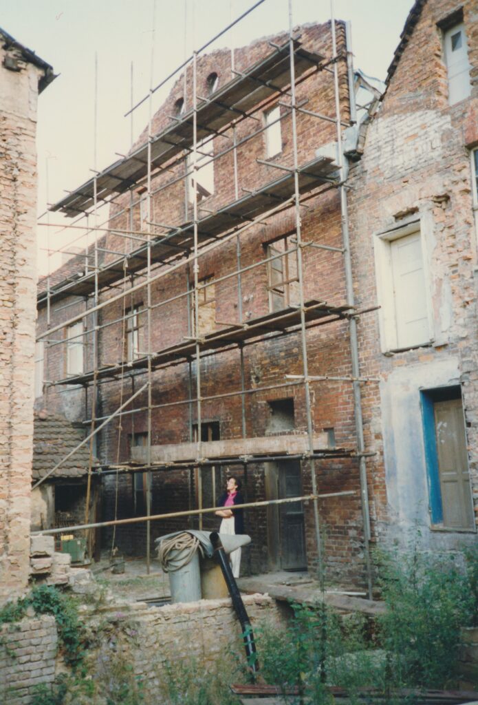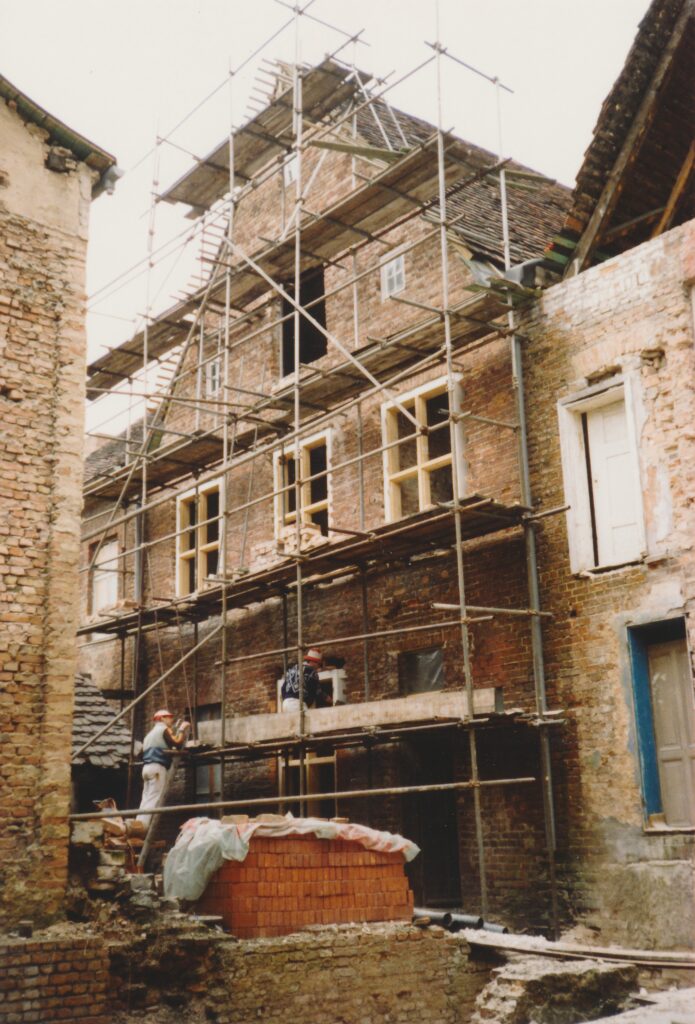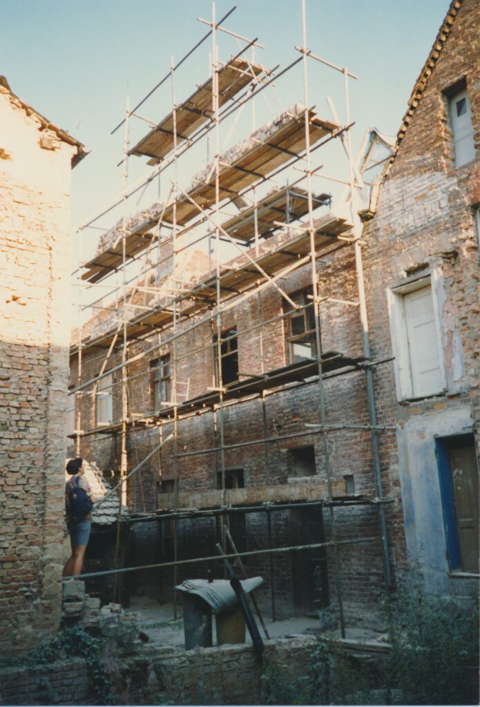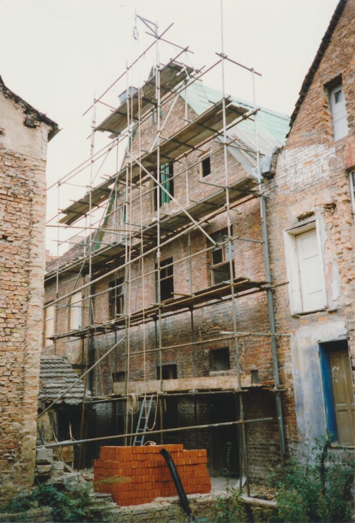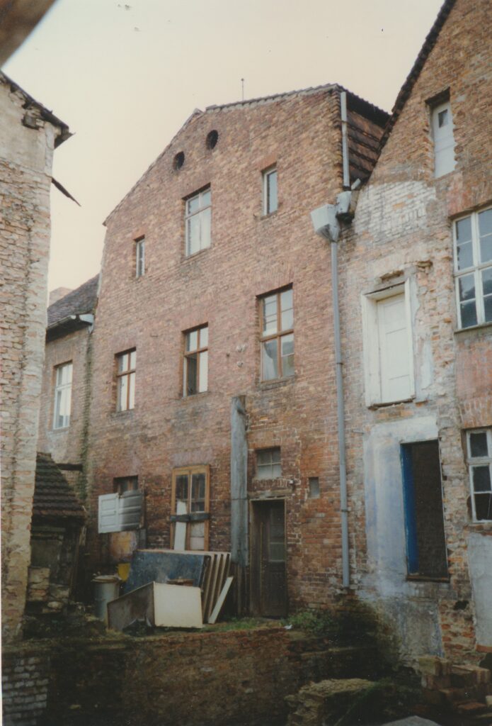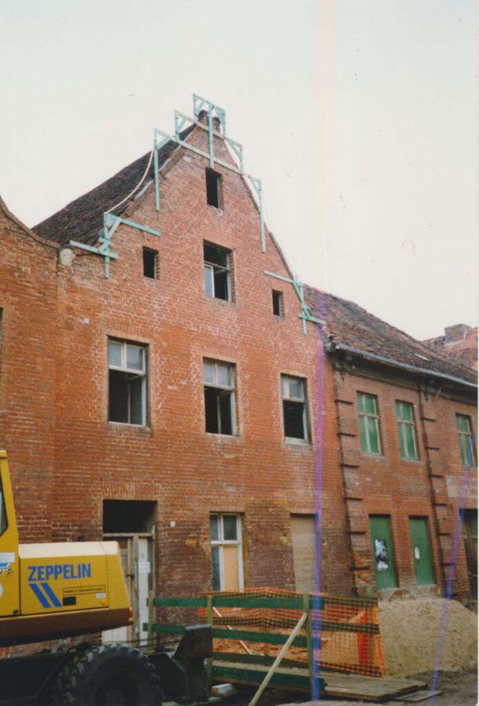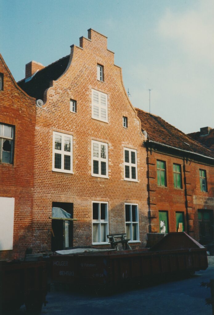 Zurück zum Schnorch – ja, so roch auch unser Haus, kein Wunder, denn es hatte einige Zeit leer gestanden und konnte mit allem aufwarten, was eine Sanierung so mühselig macht: undichte Dachkehlen, infolgedessen Schwamm, Schimmel, Moder, weggefaulte Balkenköpfe, so dass nur noch die aufliegende Dielung dafür sorgte, dass nicht gleich die ganze Zimmerdecke gen Süden sauste, außerdem Holzbockbefall, versottete Schornsteine, durch die die gesamte Mittelwand des Hauses mit Teer vollgesogen war, Fenster und Türen, die teilweise barock, teilweise jünger waren, denen aber sämtlichst die Fenstergriffe oder Türklinken fehlten, weil die von Altmetall-Dieben herausgebrochen waren, um sie zu einem Spottpreis an Aufkäufer zu verhökern – und diese Liste ließe sich noch ewig fortsetzen. Hinzu kam, dass Handwerker Anfang der neunziger Jahre auch nicht leicht zu bekommen waren: das ganze Land brauchte sie ja. Auch gab es noch keinen Mobilfunk, um sich zu verständigen, einen Festnetzanschluss hatten ebenfalls nur die wenigsten, so dass Absprachen entweder direkt mündlich oder per Brief getroffen werden mussten – und bis zum nächsten Baustellenbesuch konnte man nur hoffen, dass irgendetwas passiert war. So ähnlich lief auch die Abstimmung mit den im Aufbau befindlichen Behörden: niemand wusste wirklich, welche Regeln gerade galten, das machte es einerseits schwierig, andererseits bot es Möglichkeiten zum kreativen Umgang mit dem Recht und zur unkonventionellen Erledigung von Angelegenheiten, die sich heute wohl ewig hinziehen würden. Ein Beispiel: im Erdgeschoss unseres Hauses befand sich ein Türrahmen, der in seinem oberen Teil durch einen Rundbogen, man sagt wohl auch Korbbogen dazu, abgeschlossen wurde – die dazugehörige Tür gab es nicht, zumindest befand sie sich nicht im Haus. Dann aber erfuhren wir, dass jemand angeblich diese für das Holländische Viertel ungewöhnliche Tür im Lager der Denkmalpflege im ehemaligen Stasigefängnis in der Lindenstraße gesehen habe, sie sei mit einem auf das Türblatt gepinseltem „M“ wie „Mittelstraße“ und unserer Hausnummer markiert gewesen. Also fuhren wir gleich dorthin, erklärten, wir hätten gerne unsere Tür zurück – und tatsächlich ging ein Mitarbeiter der Denkmalpflege mit uns durch den Zellentrakt, in dem vor kurzem noch Gefangene unter unsäglichen Bedingungen einsitzen mussten, öffnete eine Tür, hinter der sich allerlei geborgene Gegenstände aus dem Viertel befanden – und dort entdeckten wir dann auch gleich die Tür, die heute zu unserem Wohnzimmer führt. Sie wurde uns nach heutiger Erinnerung ohne irgendeine Prüfung unserer Personalien, Eigentümerstellung o.ä. ausgehändigt, wir packten sie ins Auto, begeistert, ein weiteres Puzzleteil auf dem Weg zur Wiederherstellung des Hauses erhalten zu haben.