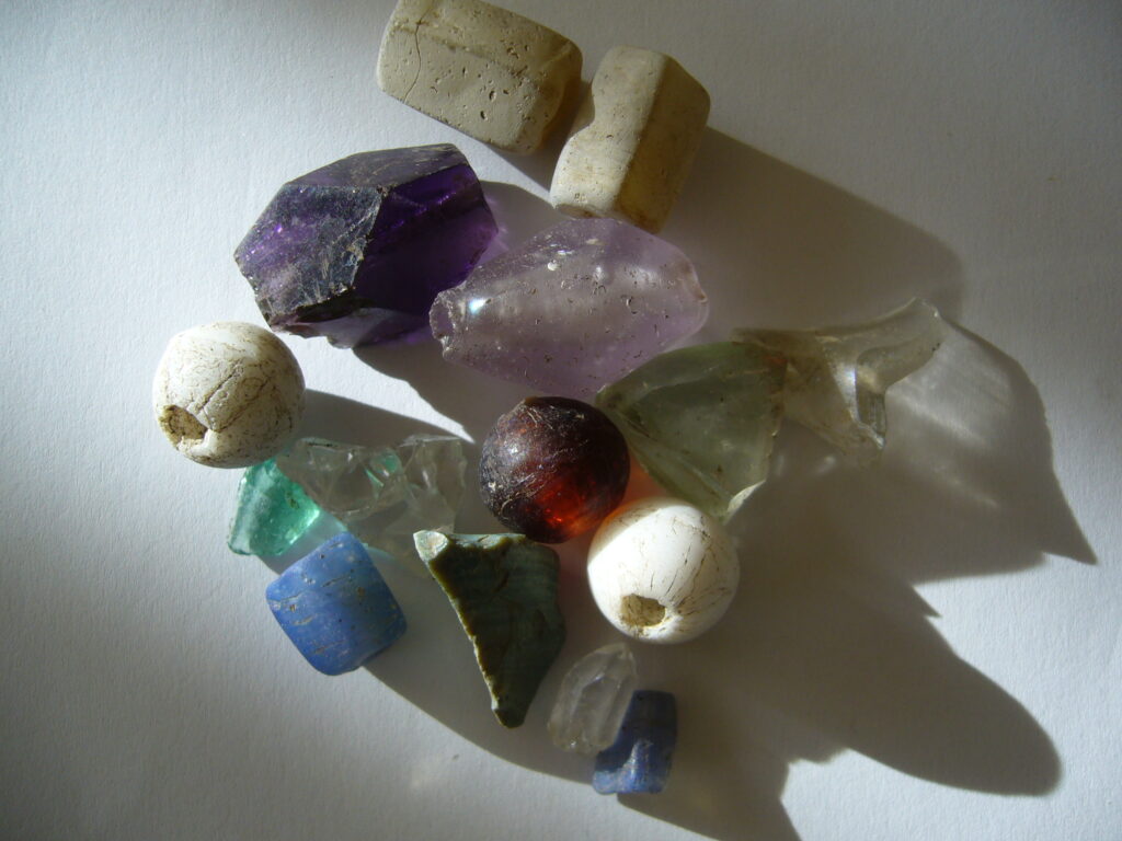 Bei gartenarchäologischen Suchgrabungen im Jahr 2014 fand man in diesem Bereich neben Keramik-, Eisen-, Ziegel- und anderen Bruchstücken eine große Anzahl Perlen aus farbigem Glas sowie Glasschlacken. Es ist wahrscheinlich, dass einige Grabungsbefunde der frühen Zeit des Holländischen Gartens zuzurechnen sind. Denn die späteren Glasperlen des Parterres wurden durchgehend als blau beschrieben, ergraben wurden aber auch weiße, rote, grüne, braune, bernsteinfarbige sowie dunkel- und helllilafarbene Perlen. Außerdem fand man Glas- und Eisenschlacke, Muschelfragmente, Malachitbruchstücke, Sedimentations-, Lava- und Schieferfragmente – alle diese Materialien scheinen eher von der Grottenmauer als aus dem Parterre zu stammen. Da außerdem eine Münze aus dem Jahre 1779 zu den Fundstücken gehört, könnten auch die reichen Glasfunde teilweise auf die erste Gestaltungsphase der Mauer und des Parterres unter Heydert zurückgehen. Dafür spricht ein Vergleich mit den Glasperlen des Grottensaales, die den 1760er Jahren entstammen. Besonders die weißen und blauen Perlen stimmen in ihrer äußeren Erscheinung und auch in ihrer chemischen Zusammensetzung nahezu überein, so dass sie möglicherweise aus einer Schmelze stammen könnten. Vielleicht handelte es sich dabei um die Restbestände der Grottenmauer-Dekoration, die Heydert 1767 an Kambly und Müller für den Grottensaal verkaufte. In diesem Fall hätte sich Reste der gläsernen Grottiermaterialien von Heydert auch im Grottensaal des Neuen Palais bewahrt.