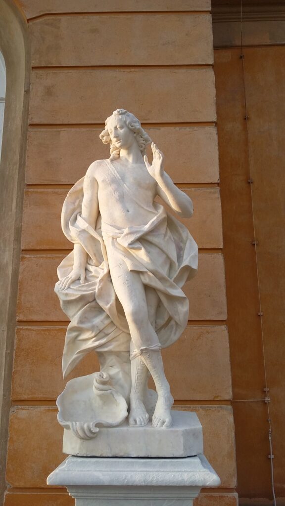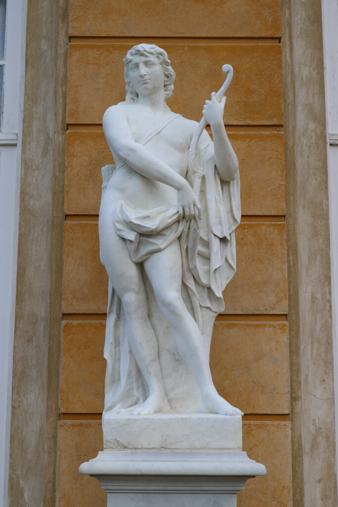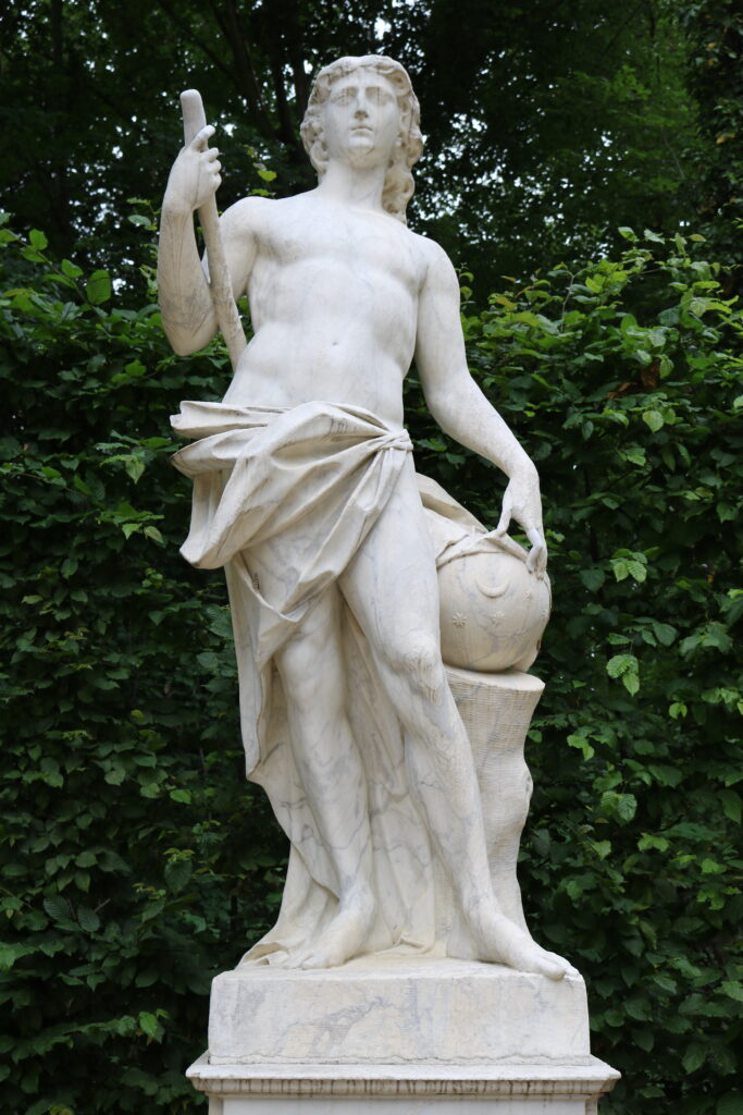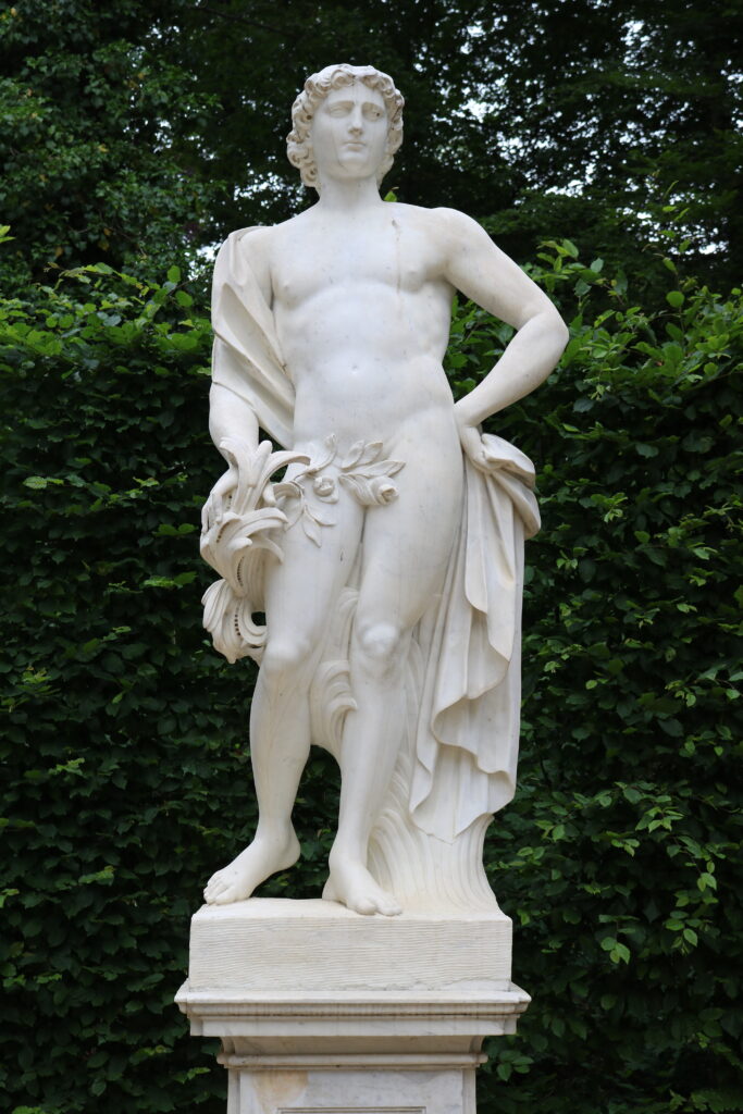 Um die beiden anderen ursprünglich zu dieser geschätzten Vierergruppe gehörenden Skulpturen zu sehen, spazieren wir zu dem Rondell am Hauptweg direkt unterhalb der Neuen Kammern. Seit Ende des 18. Jahrhunderts stehen Apoll und Antinous an diesem Ort. Nach dem Tod Friedrichs II. waren die meisten der im Park aufgestellten vergoldeten Bleifiguren seiner Zeit durch Witterungseinflüsse derart beschädigt gewesen, dass man sie entfernen musste. So auch in diesem Rondell, in dem ehemals acht Plastiken aus vergoldetem Blei von Georg Franz Ebenhecht (um 1710-1757) gestanden hatten. Auch sie verschwanden, der Rundplatz musste mit anderen Figuren bestückt werden. Eine Quelle von 17941 beschreibt erstmals die veränderte Skulpturenausstattung: neben mehrfigurigen Gruppen aus Carrara (ebenfalls aus der Lieferung des Grafen del Medico) werden „vier Statuen von Marmor“ erwähnt, darunter Apoll und Antinous.