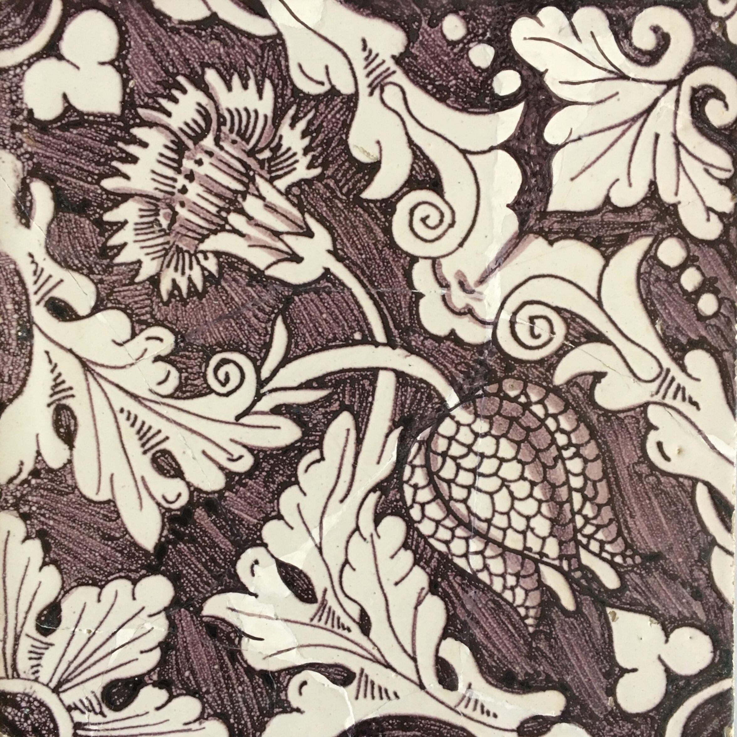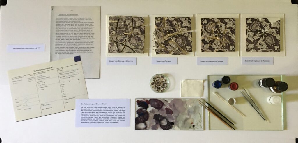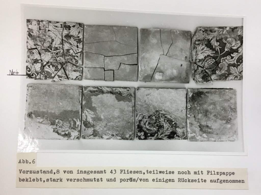 Von der originalen Fliesenausstattung im Jagdschloss Stern sind nur noch die hier beschriebenen manganfarbenen Ornamentfliesen erhalten. Sie waren zwar stark beschädigt, aber überwiegend noch in situ vorhanden. Eine kleine Ausstellung im Jagdschloss Stern vermittelt einen Eindruck von der aufwändigen Restaurierung dieser Ornamentfliesen während der Sanierung des Schlosses in den 1980er Jahren.