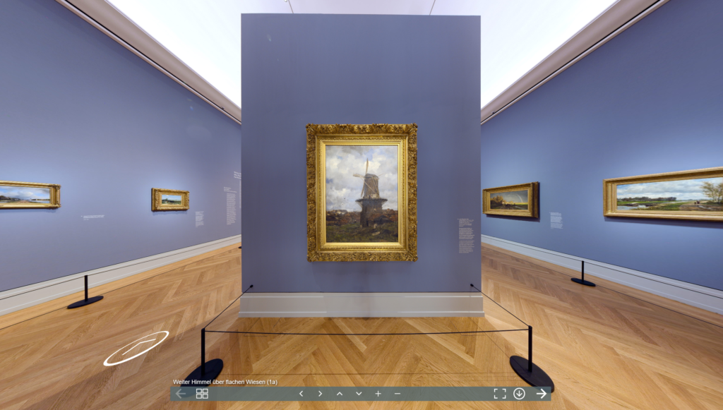 Der 360 Grad Rundgang der Ausstellung „Wolken und Licht. Impressionismus in Holland“ ermöglicht genau das und noch viel mehr. Ob als individuelle Vorbereitung auf den Ausstellungsbesuch, als anschließende Vertiefung oder interaktiv als live geführte Online-Tour bequem von überall. Die Ausstellungsansichten ermöglichen einen individuellen virtuellen Rundgang in beliebiger Raumfolge mit nur einem Klick. Wandtexte und Werkinformationen sind ebenso hinterlegt, wie detailgenaue Abbildungen der Kunstwerke, die eine 100-fache Vergrößerung ermöglichen und Farbauftrag und Pinselstruktur enthüllen.