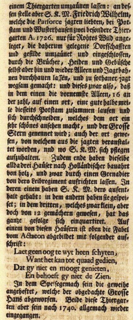 Particularly interesting is the following letter from Frederick William I to v. Hacke, abbreviated as usual in the cabinet minutiae in the form of address and greeting: “My dear etc., I am satisfied that the Dutchman has produced all kinds of work before 150 thlr, which you have the good grace to make known to him, I am etc. Wusterhausen, 23rd Oct. 1731”. This is clear evidence that at least one Dutch craftsman was involved in the construction of the hunting lodge. This possibly refers to the grenadier and master carpenter Cornelius van den Bosch, who came to Potsdam from Holland in 1722. He is also mentioned in the records in connection with the receipt of timber deliveries and was also active in other major building projects in Potsdam, including the construction of the Garrison Church. This also matched the tradition in Bekmann’s Historische Beschreibung der Chur und Mark Brandenburg (1751), according to which the king had his hunting lodge at the Stern of Dutch design erected by a grenadier from his personal regiment. As far as can be seen, this is the first description of this place, which mentions the Thiergarten laid out by King Frederick William I in Potsdam and also the ensemble of buildings at the original 16-rayed Potsdam Hunting Star, “which gives the place a very beautiful appearance and is called the Great Star”.